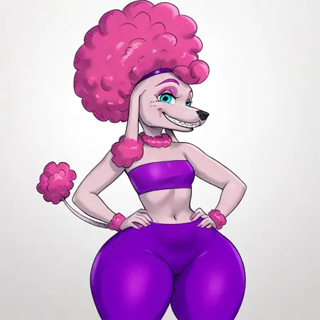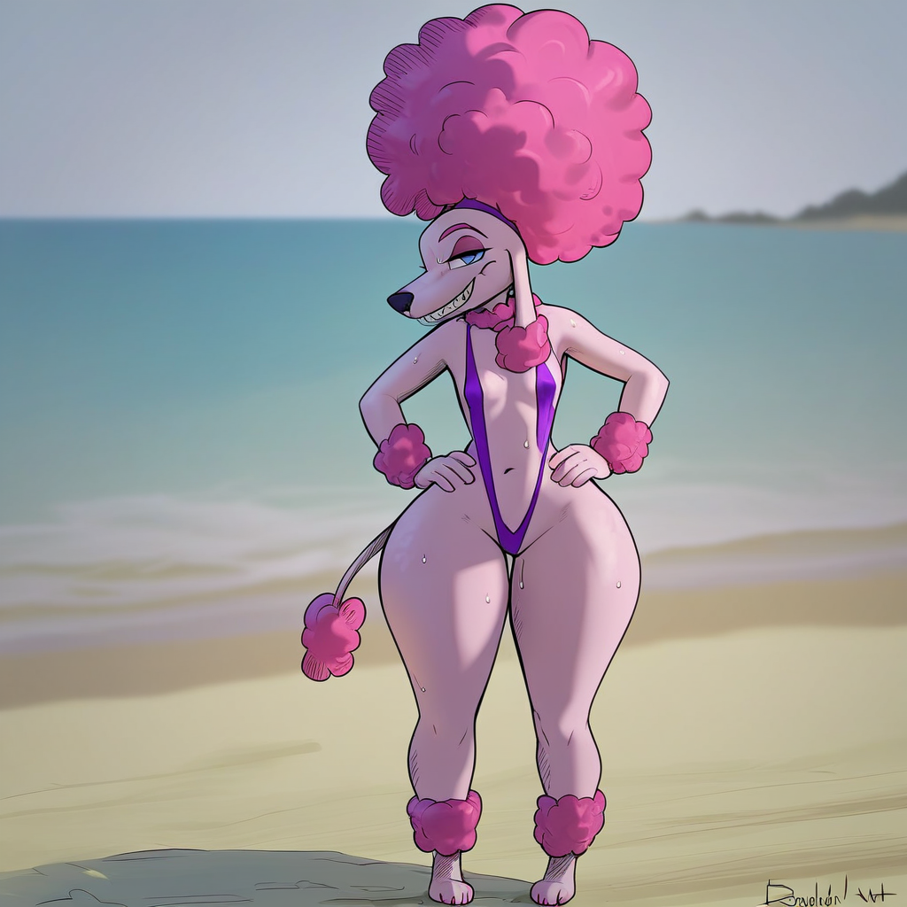 dog, dog girl, poodle, pink fur, pink hair, afro, black nose, fluffy neck fur, fluffy wrists, fluffy ankles, dog tail, fluffy tail tip, dog ears, wide hips, large ass,