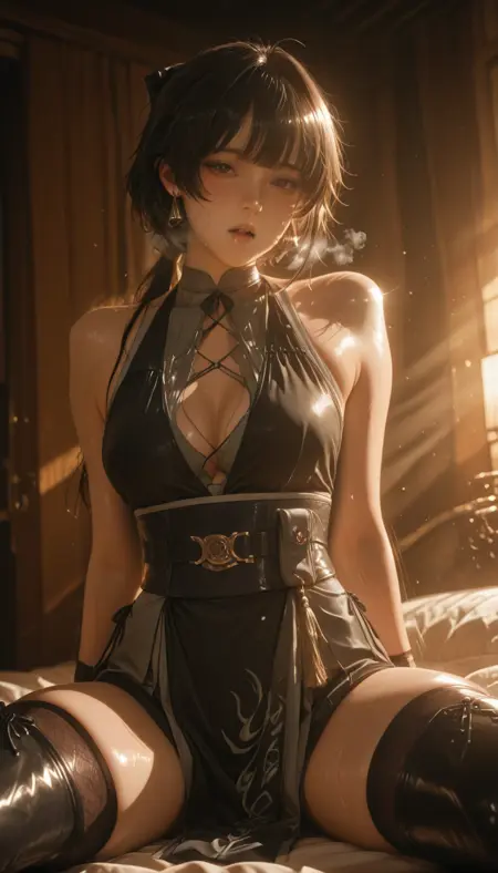 장갑, 드레스, 허벅지 스타킹, 리본, 가슴선, 보석, 어깨 노출, 속옷, 팬티, 허벅지, 소매 없음, 검은 장갑, 벨트, 검은 허벅지 스타킹, 검은 드레스, 소매 없는 드레스, 검은 팬티, 분리된 칼라, 사이드부브, 두꺼운 허벅지, 태셀, 차이나 드레스, 골반 커튼, 사이드 티 팬티, 검은 벨트, 주머니, 벨트 주머니, 팔꿈치 패드, 사이드리스 아웃핏, 팬티 스트랩, 피부 인덴테이션,