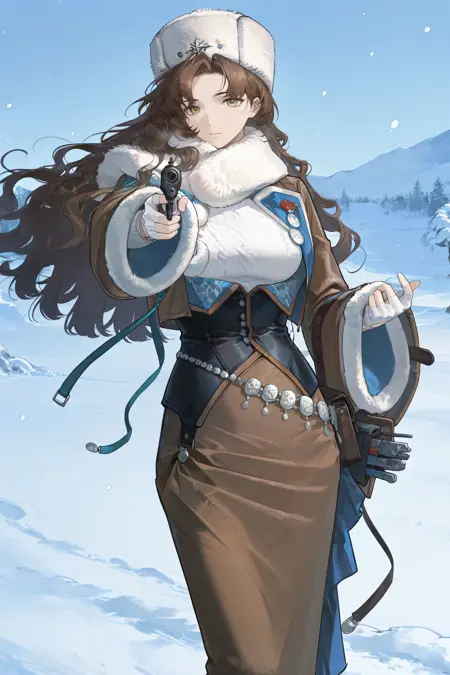 털 장식 스카프, 갈색 재킷, 짧은 재킷, 흰색 스웨터, 검은 코르셋, 보석, 긴 소매, 넓은 소매, 털 장식 소매, 흰색 장갑,