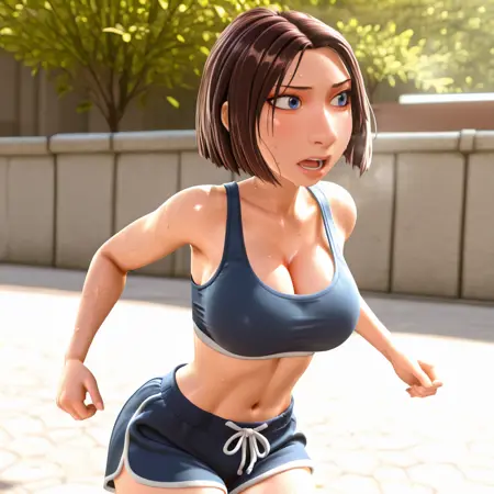 Trigger with blue shirt: ColetteBlue, 1girl, short hair, black pants, blue shirt, brown hair, cowboy shot, 3d