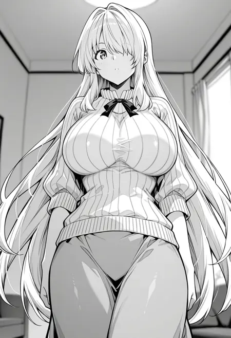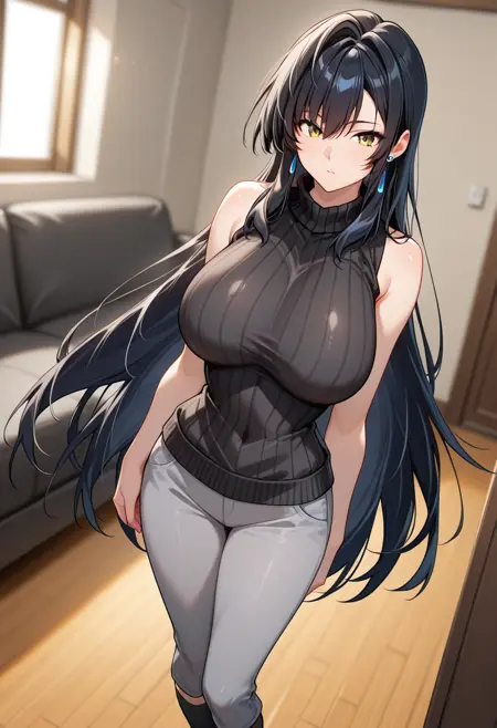 1girl,touka,mom,housewife,milf,mother,mature female,very long hair,hair intakes,bangs,large breasts,sweater,turtleneck,sleeveless sweater,ribbed sweater,bare shoulders,pants,socks,jewelry,earrings,weeding ring