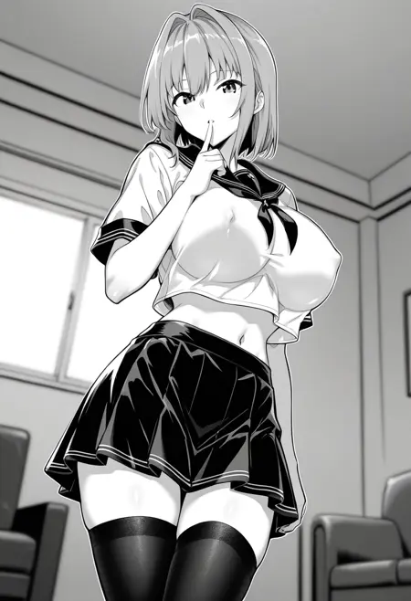 aoi,1girl,solo,short hair,hair intakes,large breasts,school uniform,crop top,sailor collar,short sleeves,covered nipples,navel,black skirt,plated skirt,black thighhighs,footwear,serafuku