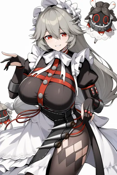 alexandrina sebastiane,1girl, long hair, red eyes, maid, apron, maid headdress, dress, very long hair, solo, black footwear, low-tied long hair, harness, maid apron, gloves, high heels, grey hair, juliet sleeves, puffy sleeves, black dress, black gloves, chest harness