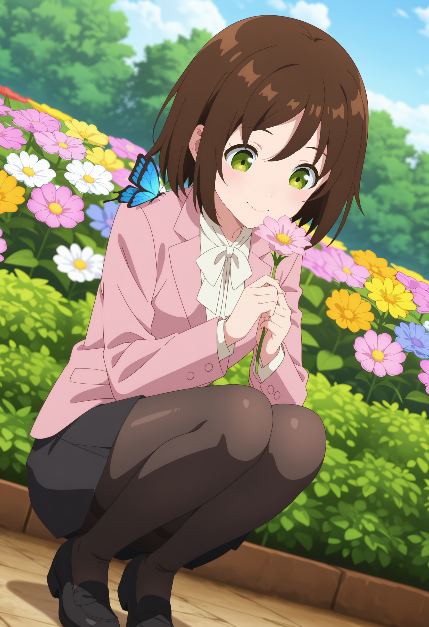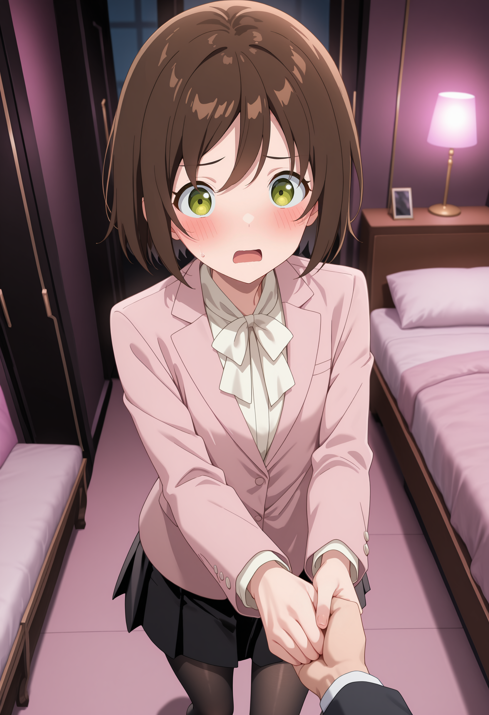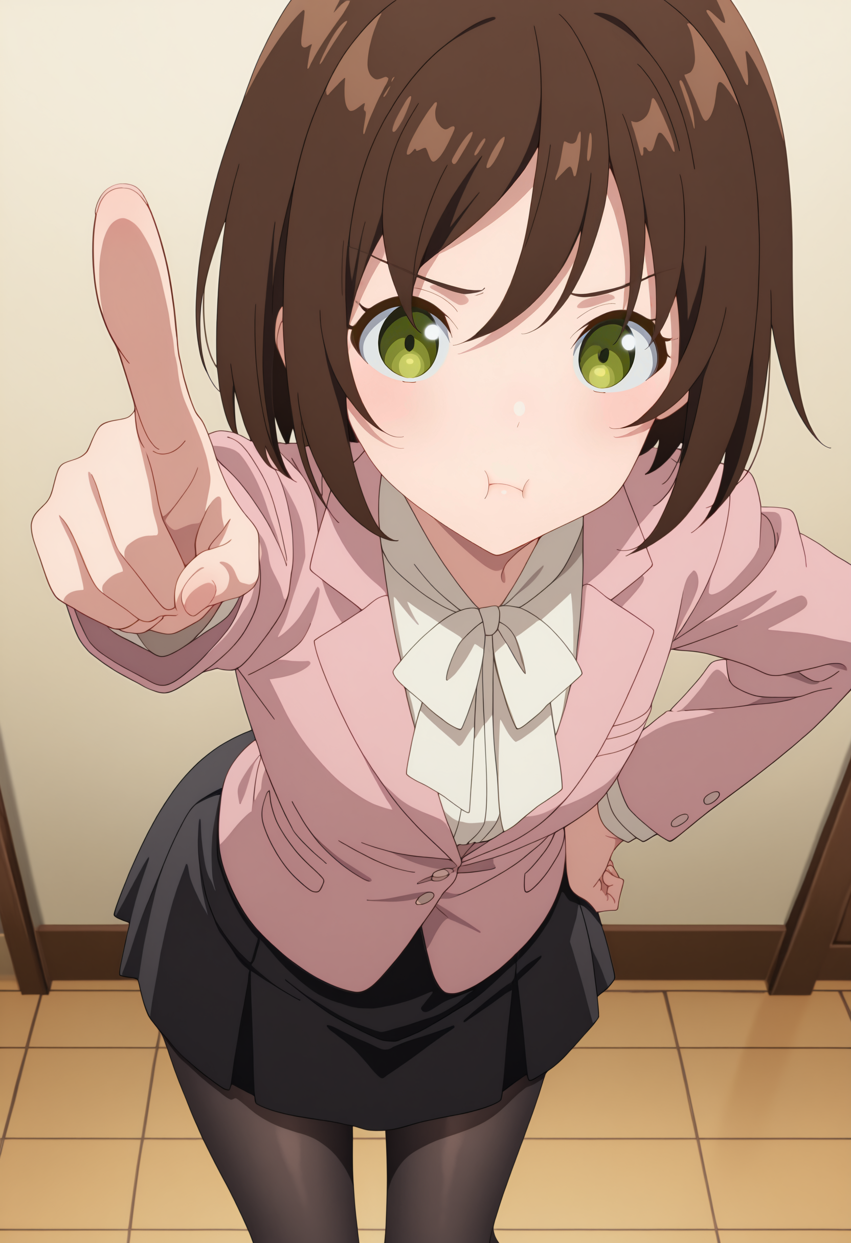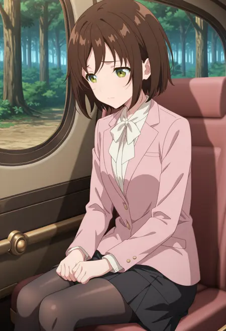 pink jacket, blazer, shirt, black skirt, black pantyhose,