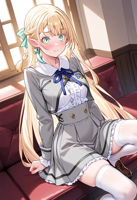 ludivine_marie,1girl,solo,blonde hair,long hair,braid,green eyes,pointy ears,school uniform,neck ribbon,blue ribbon,long sleeves,shirt,grey jacket,grey skirt,high-waist skirt,frills,white thighhighs,hair ribbon,green ribbon,earrings,jewelry,shoes,brown footwear,