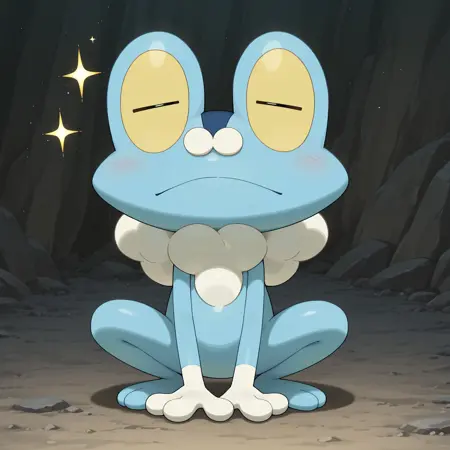 标签: 宝可梦(生物)、两栖动物、青蛙、蓝色皮肤、黄色眼白、黑色眼睛、白色手掌、蓬松的颈部绒毛、白色颈部绒毛、三指、二趾