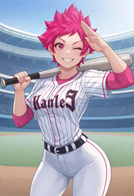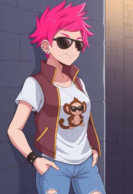 カスタム衣装: kmt0ra、ピンクの髪、短髪、とがった髪、ピンクの目