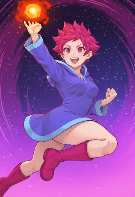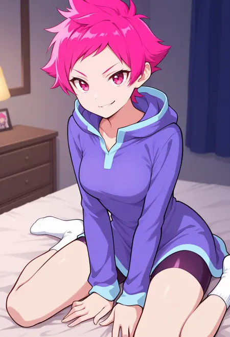 デフォルトの外見: kmt0ra、ピンクの髪、短髪、とがった髪、ピンクの目、フード付きのドレス、紫のドレス、長袖、中くらいの胸、ブーツ、ピンクの履物