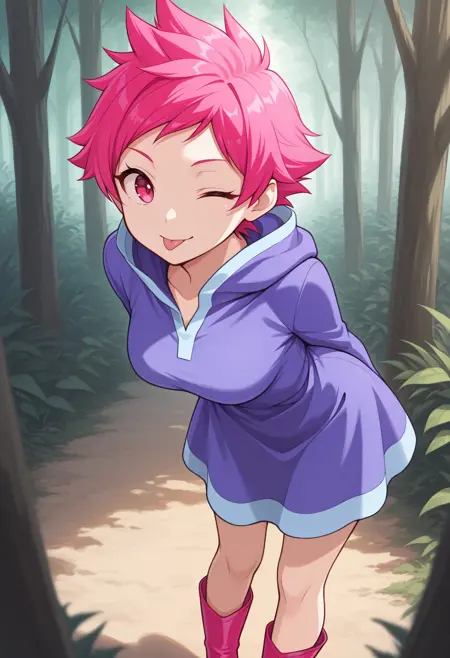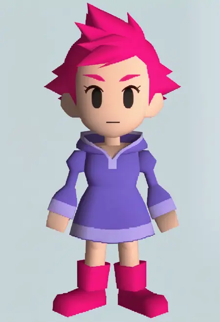默认外观: kmt0ra,粉发,短发,刺状头发,粉眼,带帽长裙,紫色长裙,长袖,中等胸部,靴子,粉红色鞋履