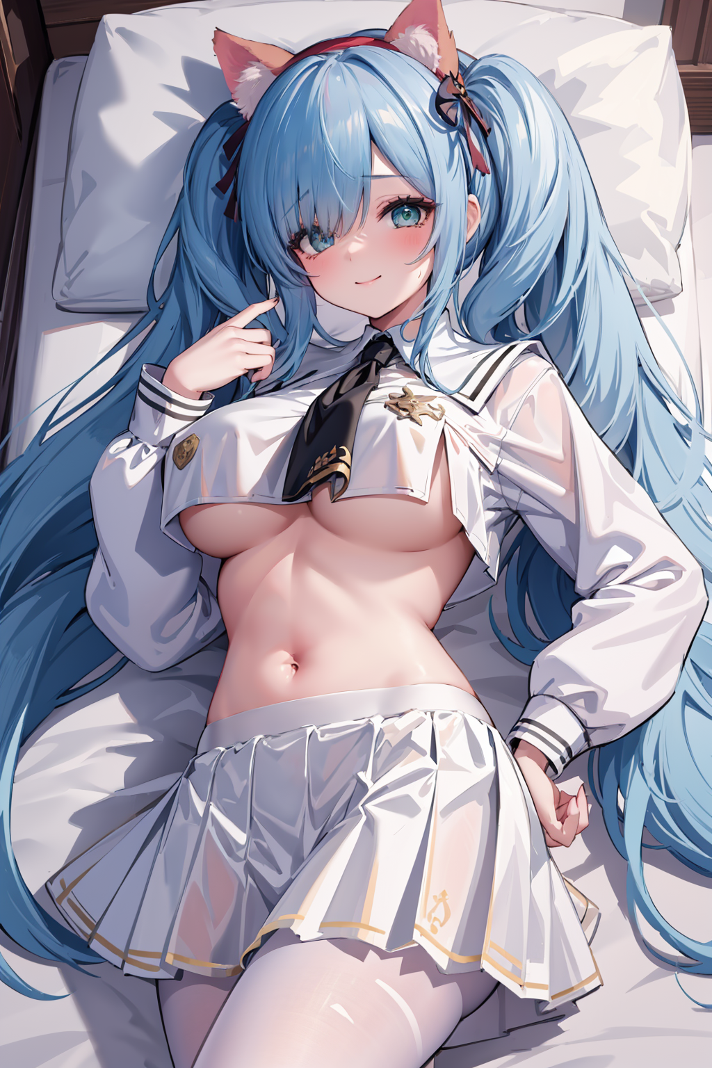 옷: 학교 유니폼, 크롭탑, 긴 소매, 흰 셔츠, 흰 치마, 흰 팬티스타킹