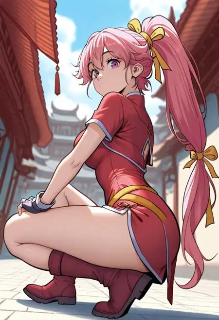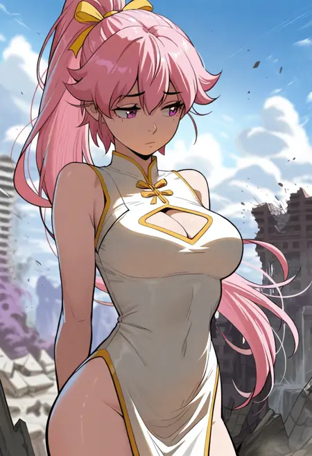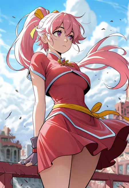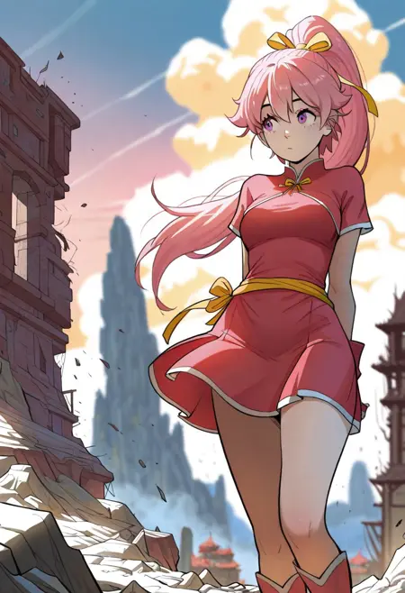 xiaoxue, 1girl, solo, pink hair, ponytail, violet eyes, long hair, yellow ribbon,