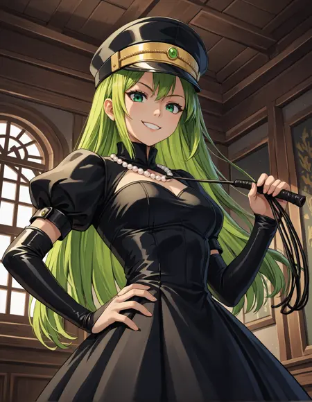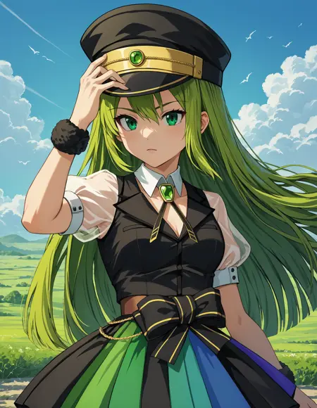 魔法服装: mgrcalinagray, alnmgc, 长发, 侧发, 黑色尖顶帽, 白色分离式衣领, 绿色颈饰宝石, 黑色十字领结, 黑色背心, 透明短蓬袖, 棕色腰带, 黑色腰间蝴蝶结, 黑色皮毛袖口, 多色百褶裙, 吊袜带, 毛边渔网过膝袜