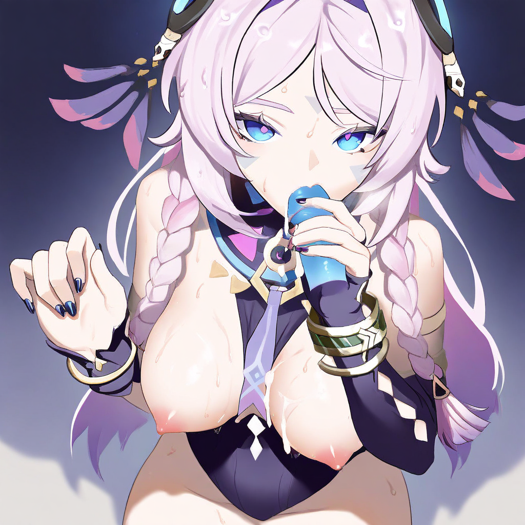 (Genshin_Citlali, 긴 머리, 분홍색 머리, 앞머리, 땋은 머리, 쌍둥이 땋은 머리, 파란 눈, 보석, 팔찌, 레오타드, 장갑, 네일 폴리쉬),