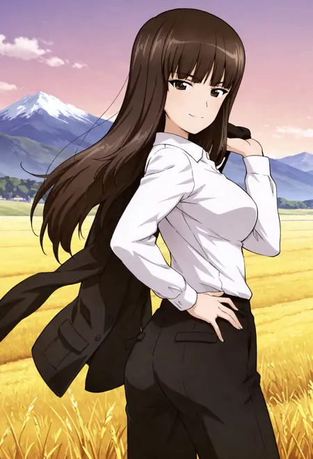 nishizumishiho, brown hair, brown eyes, long hair, blunt bangs, mature female, breasts,