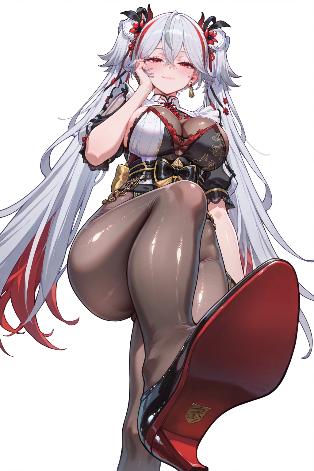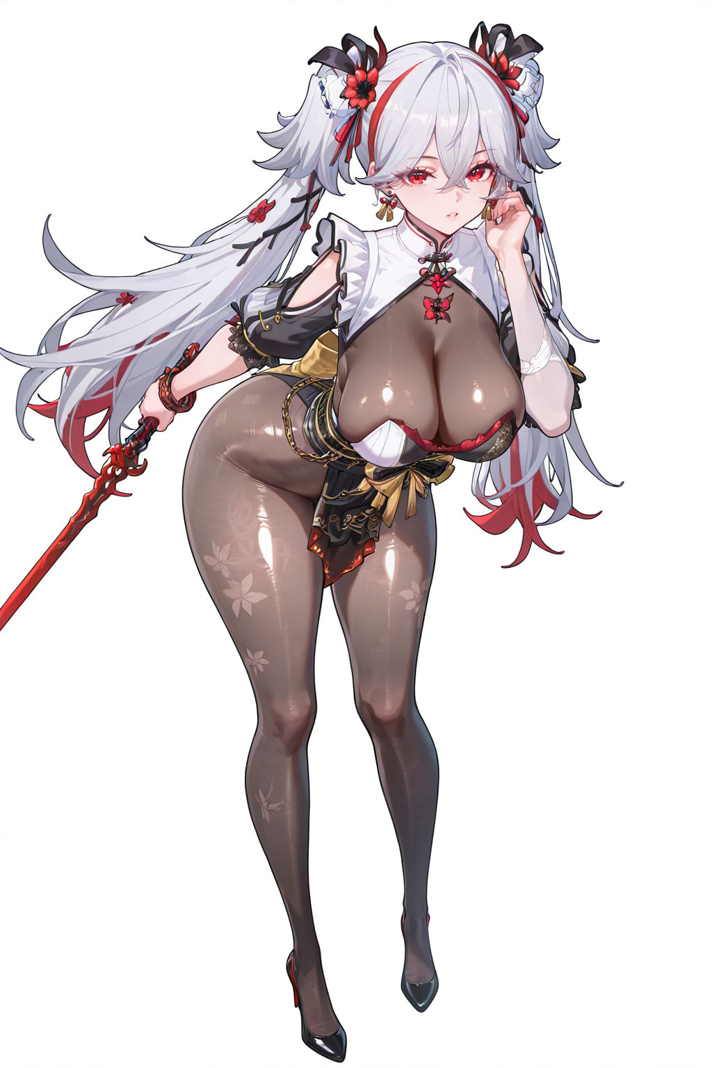 chun,1girl,solo,grey hair,hair between eyes,hair ornament,hair over one eye,long hair,multicolored hair,red hair,streaked hair,twintails,red eyes,large breasts,cleavage,bow,earrings,flower,jewelry,chain,ribbon,red flower on chest,black dress,chinese clothes,short sleeves,no panties,pelvic curtain,black print bodystocking,see-through,high heels,