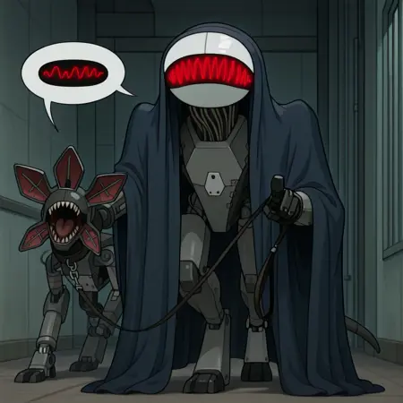 itcond1,机器人,巨大的白色头部,无眼睛,无嘴巴,脖子由电线组成,蓝色斗篷,帽子抬起,发光的红色波形面部标记