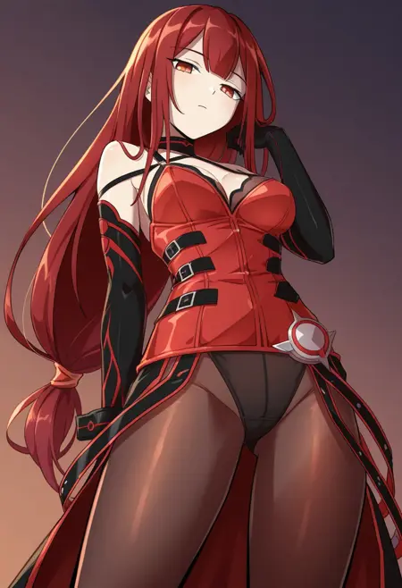 1 girl, elesisDK, red hair, long hair, red eyes, scarf, red scarf, tight clothes, bodysuit, highleg leotard, elesisdk leotard, black leotard, corset, latex pants, showgirl skirt, black thighhighs, black boots, thigh boots, elesisdk thigh boots