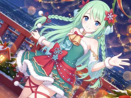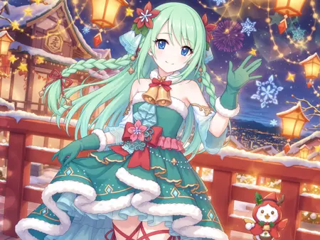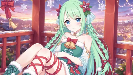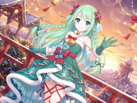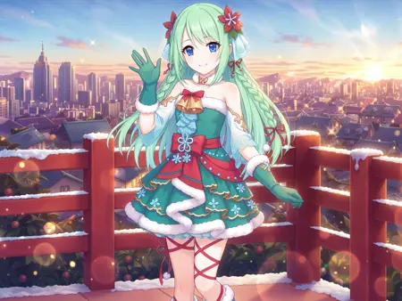 より詳細な、驚異的に荒唐無稽な解像度、壁紙、lora:Chika:0.8、1人の女の子、青い目、緑の髪、長い髪、リボン、緑の手袋、編み髪、花、緑のドレス、髪飾り、鈴、ファー縁取りのドレス、笑顔、ファー縁取りの手袋、足のリボン、髪の花、髪のリボン、赤いリボン、裸の肩、二重編み髪、フリル付きのドレス、首の鈴、リボン編み髪、都市風景、クロスレーシングの靴、手を振る、