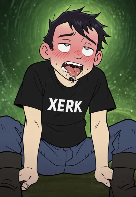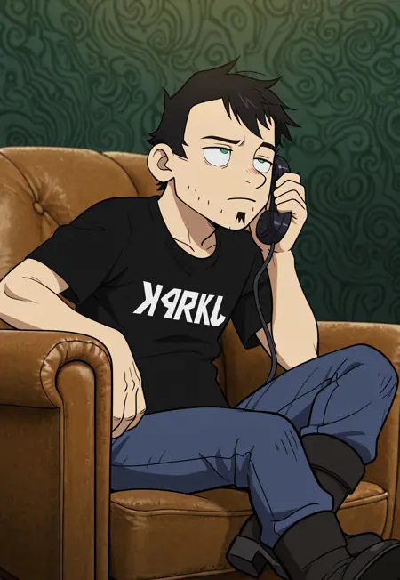 d4n, green eyes, black hair, messy hair, soul patch, stubble
