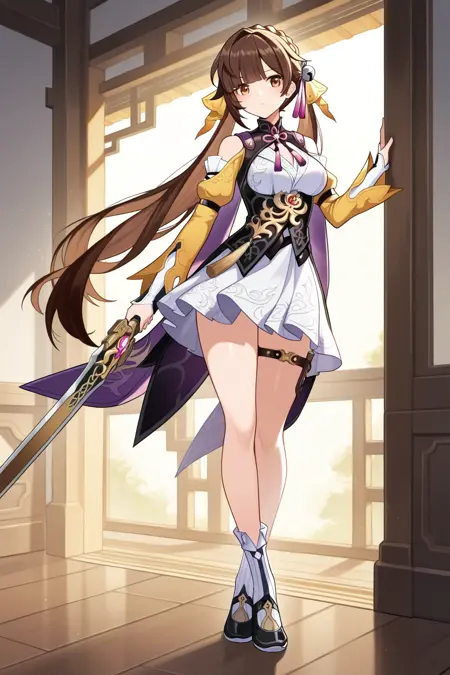 衣装:chinese clothes, hair ornament, hair ribbon, hair bell, neck ribbon, clothing cutout, white dress, corset, bare shoulders, shoulder cutout, long sleeves, detached sleeves, yellow sleeves, thigh strap, tassel, socks, non -symmetrical shoes, black footwear, holding sword, brown sword,