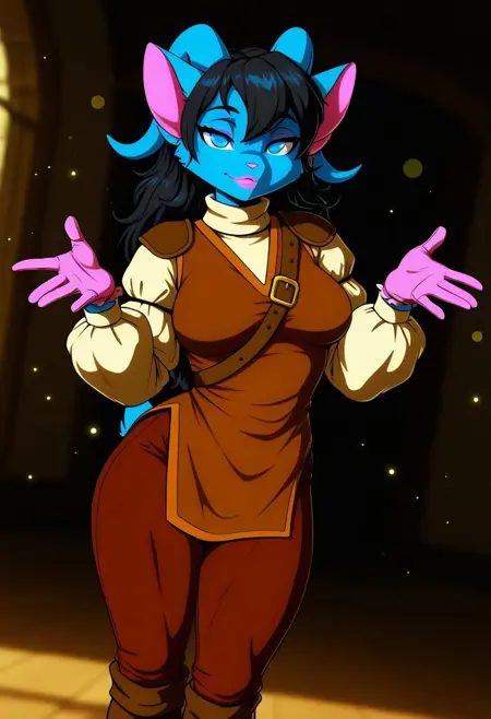 RobertaMS, 1girl, 솔로, 페르리 여성, 앤트로, 파란 털, 색이 있는 피부, 동물 귀, 파란 뿔, 검은 머리, 긴 머리, 앞머리, 파란 눈, 분홍 코, 분홍 입술, 큰 가슴, 두꺼운 허벅지, 꼬리, 파란 마법사 유니폼, 파란 재킷, 허리띠, 빨간 단추, 갈색 부츠, 갈색 골반 커튼, 장갑,