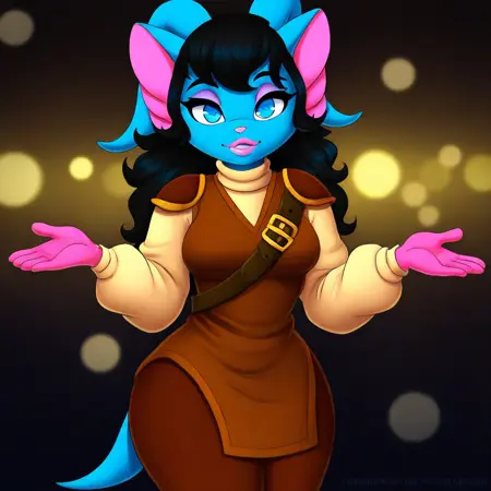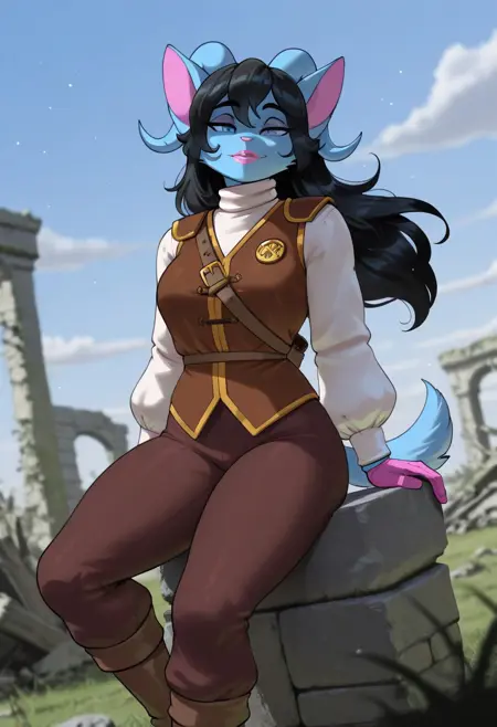 RobertaMS, 1girl, 솔로, 페르리 여성, 앤트로, 파란 털, 색이 있는 피부, 동물 귀, 파란 뿔, 검은 머리, 긴 머리, 앞머리, 파란 눈, 분홍 코, 분홍 입술, 큰 가슴, 두꺼운 허벅지, 꼬리, 베이지 터틀넥, 갈색 어깨판, 갈색 조끼, 긴 푸프 슬리브, 갈색 바지, 어깨 끈, 갈색 부츠, 분홍 장갑,