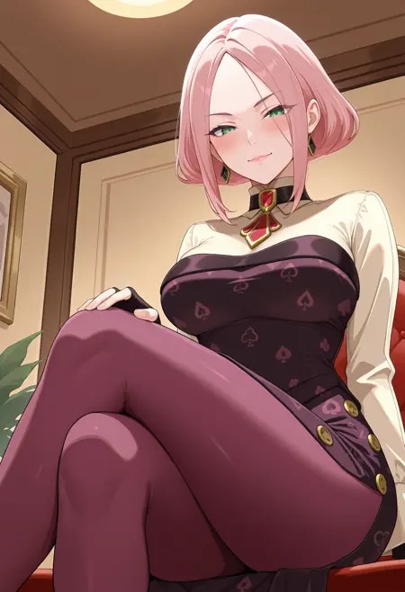 米色衬衫, 有领衬衫, 红色领结, 长袖, 无吊带连衣裙, 黑色衬衫, 衬衫外叠穿衬衫, 黑色连衣裙, 紫色连衣裙, 印花连衣裙, 扑克牌图案, 梅花 \(形状\), 黑桃 \(形状\), 红心, 方块 \(形状\), 扣子, 侧开衩, 黑色手套, 露指手套, 紫色丝袜,