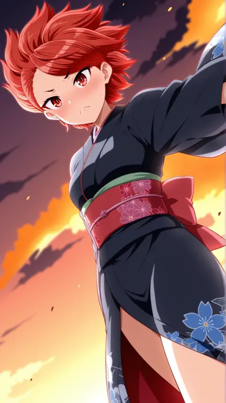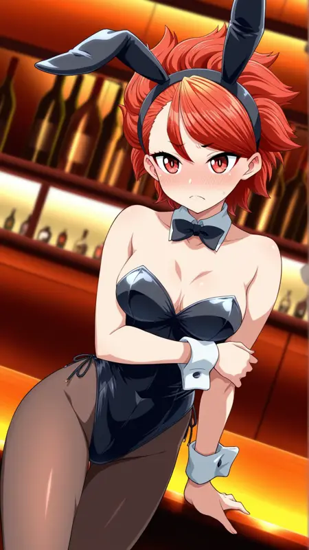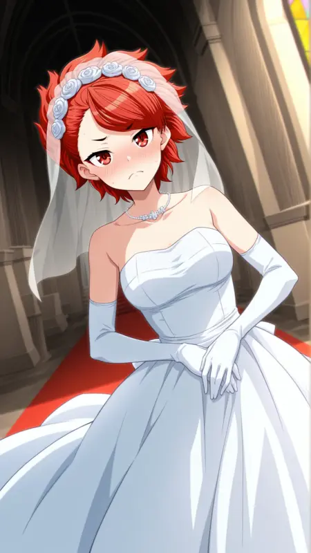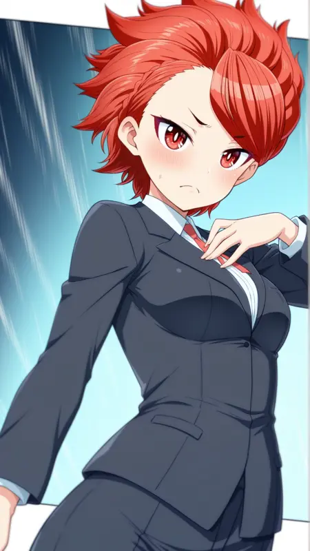 외모: 단발, 붉은 머리카락, 붉은 눈,