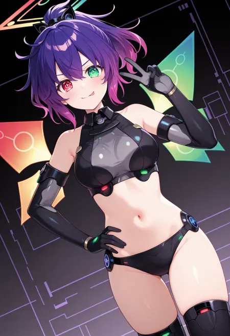 nrdicpu, purple hair, gradient hair, ponytail, heterochromia, red eyes, green eyes, power symbol-shaped pupils, rectangular halo,