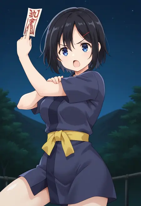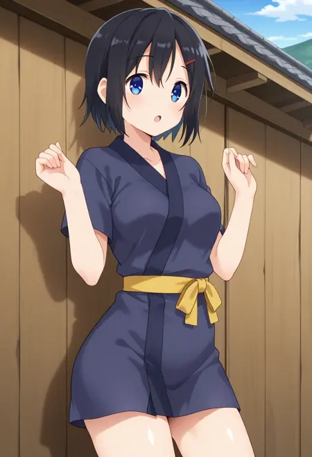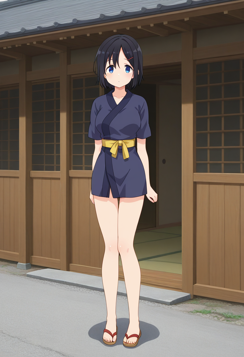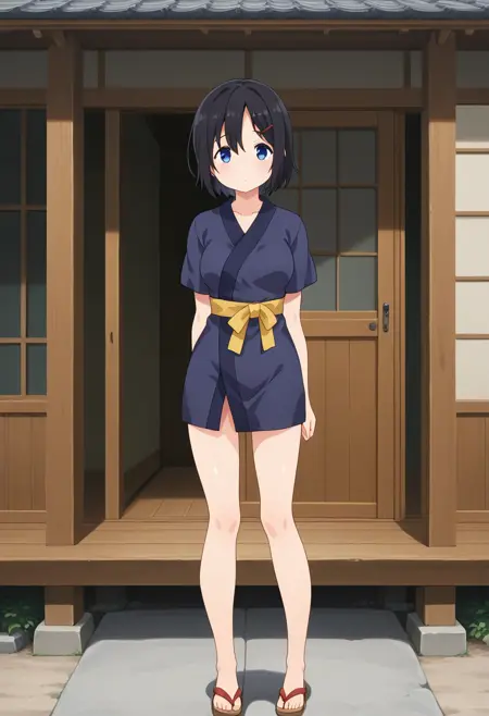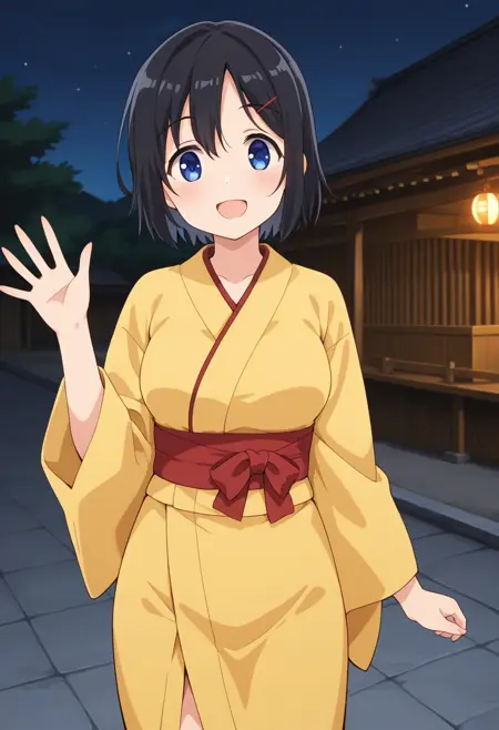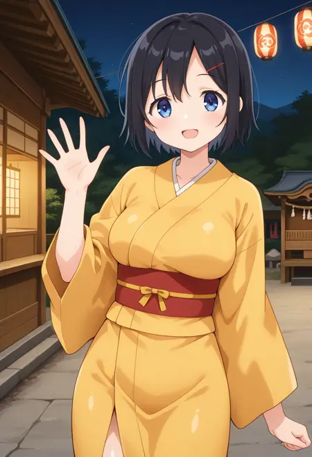 关键词:yasuzubotan,黑发,发夹,短发,蓝眼睛,中等乳房,短和服,短袖,黄色腰带,凉鞋