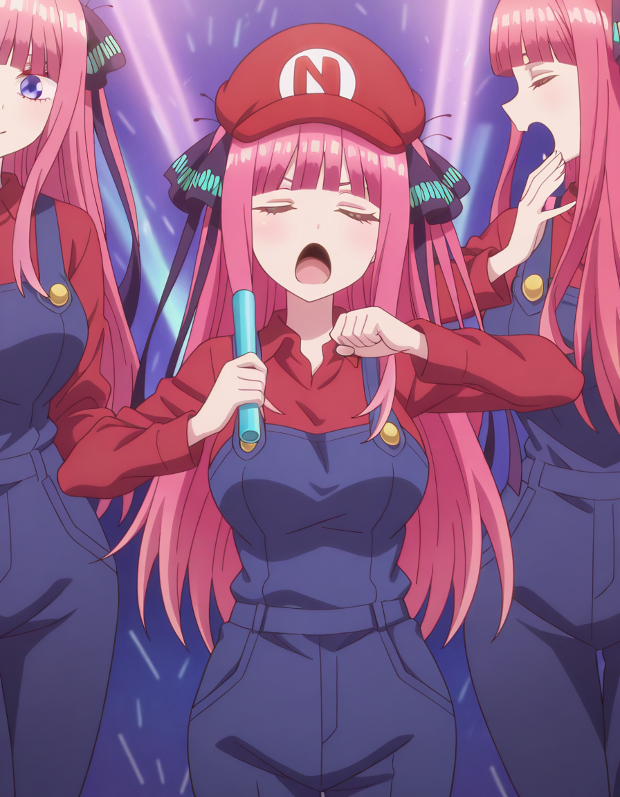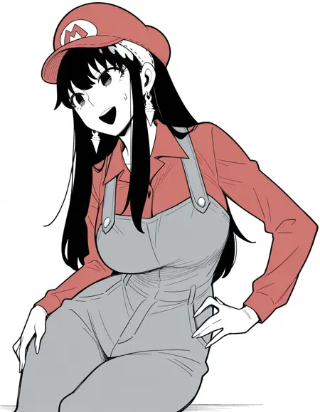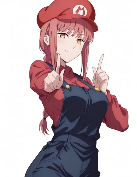 lora:mario-cosplay-illustriousxl-lora-nochekaiser:1, mario cosplay, mario (cosplay), blue overalls, overalls, shirt, red shirt, long sleeves, collared shirt, hat, red hat,