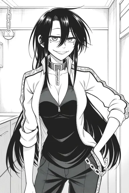 white jacket, open jacket, red shirt, cleavage, chain, collar, red skirt, pleated skirt, plaid skirt, kneehighs, loafers
