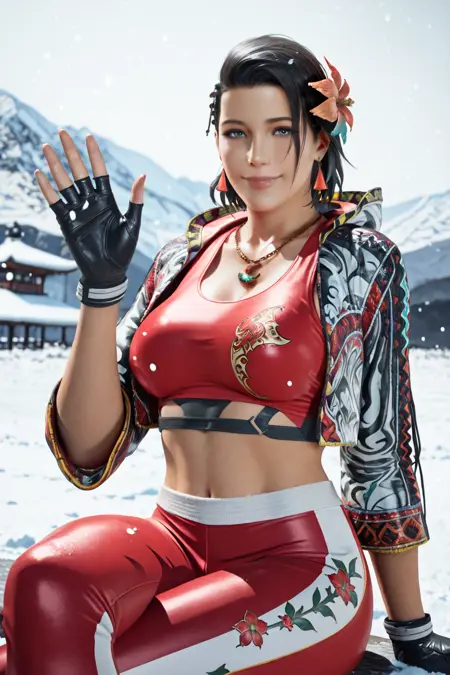 Azucena, short hair, black hair, blue eyes, grey eyes, hair ornament, jacket, earrings, black gloves, midriff, hair flower, fingerless gloves, necklace, open jacket, crop top, floral print, cropped jacket, hooded jacket, multicolored clothes, red pants, track pants, print jacket, red sports bra, sneakers