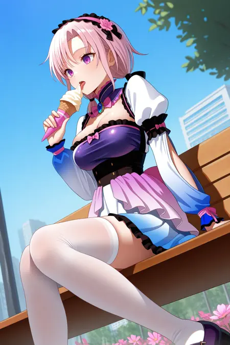 gradient shirt, purple strapless shirt, white shirt, cleavage, juliet sleeves, long sleeves, black armband, arm cutout, pink wrist ribbon, purple detached collar, blue gemstone, pink bowtie, underbust, black corset, gradient skirt, blue skirt, white skirt, pink overskirt, pink back ribbon, pink hairband, black bow, black frills, white thighhighs, purple mary janes