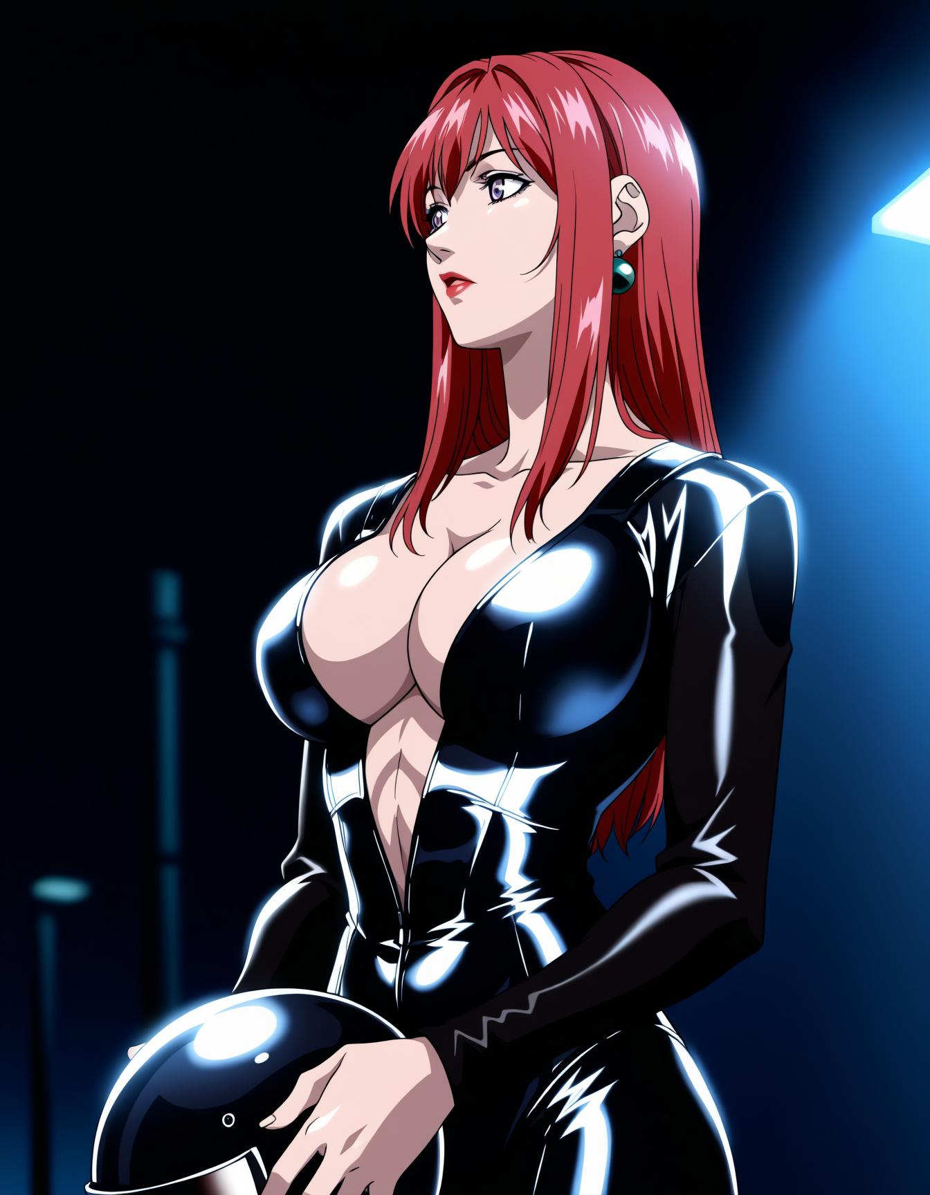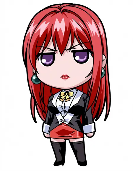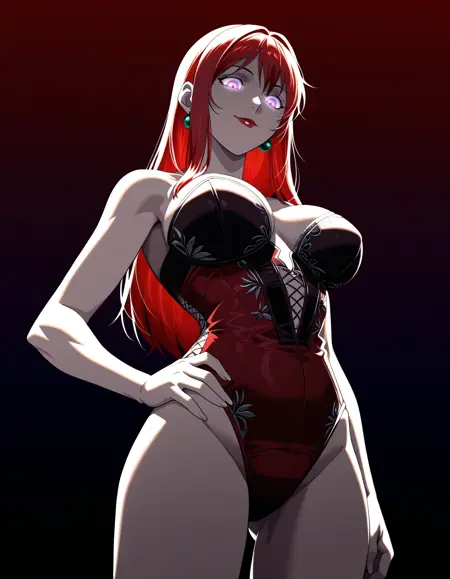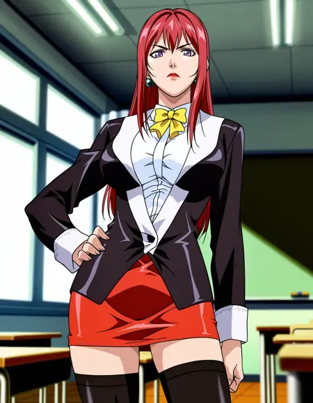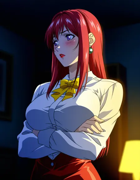 thirokobb, red hair, long hair, purple eyes, red lips, green earring, large breasts, black jacket, white shirt, yellow bow, red pencil skirt, black thighhighs, zettai ryouiki, purple underwear, black high heels,