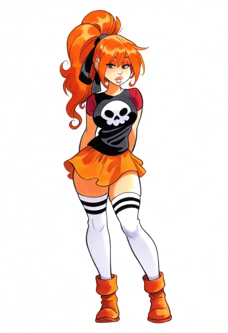 OC Trizia 프롬프트: 1girl, trizia, ponytail, long hair, orange hair, black hair ribbon, lips, black t-shirt, skull print, orange skirt, short sleeves, white thighhighs, orange boots