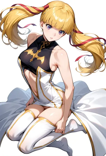 衣装3: 1人の女の子、金髪、青い目、紫の目、太ももハイ、長い髪、手袋、太ももブーツ、ツインテール、ブーツ、前髪、胸、レオタード、白い太ももハイ、ストレートの前髪、中程度の胸、髪のリボン、リボン、白い手袋、非常に長い髪、パイロットスーツ、白い靴、ヘッドセット、ポニーテール、ヘルメット、ハイヒール、ボディスーツ、白いレオタード