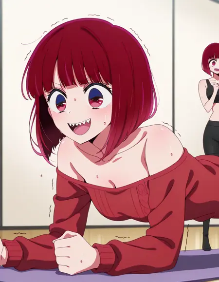 lora:yor-briar-cosplay-illustriousxl-lora-nochekaiser:1, 요 브라이어 코스프레, 요 브라이어 (코스프레), 어깨 노출, 잠금뼈, 드레스, 긴 소매, 어깨 드레스, 어깨 드레스, 어깨 오프 스웨터, 팬티 스타킹, 빨간 스웨터, 스웨터, 스웨터 드레스, 허벅지,