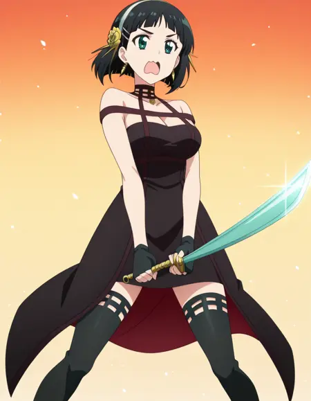 lora:yor-briar-cosplay-illustriousxl-lora-nochekaiser:1, 요 브라이어 코스프레, 요 브라이어 (코스프레), 어깨 노출, 검은 드레스, 검은 장갑, 가슴 노출, 드레스, 귀걸이, 장갑, 금 귀걸이, 머리 장식, 머리띠, 보석, 어깨 노출, 잠금뼈, 손가락 없는 장갑, 허벅지 스타킹, 검은 허벅지 스타킹,
