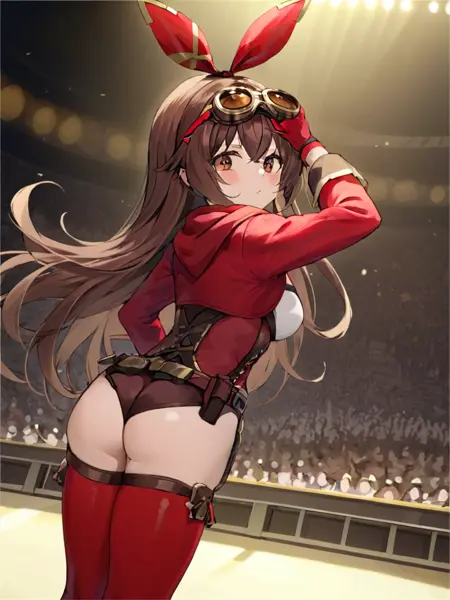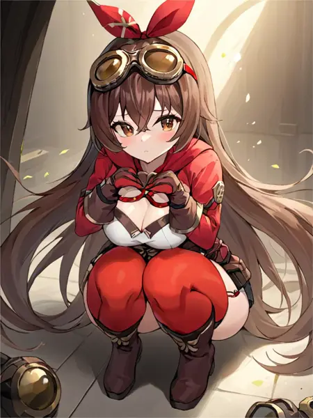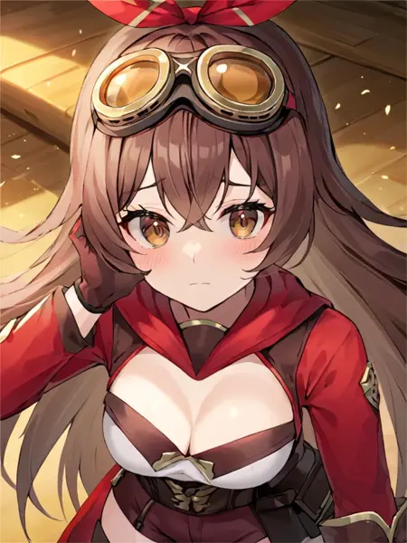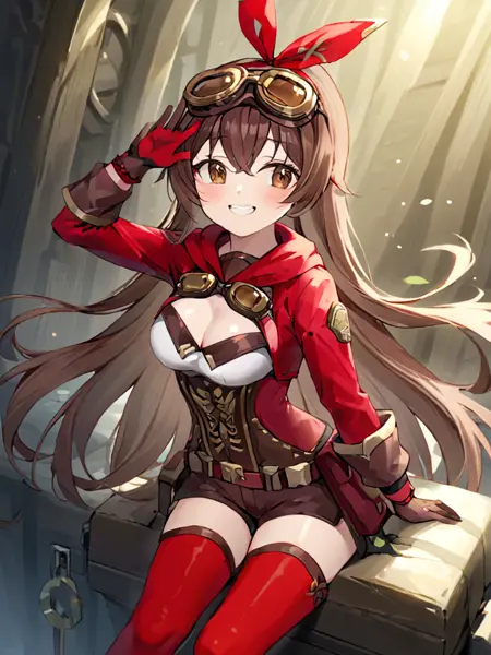 트리거어: (\an bo\),1girl,goggles,long hair,gloves,shorts,brown hair,red thighhighs,cleavage,red ribbon,long sleeves,