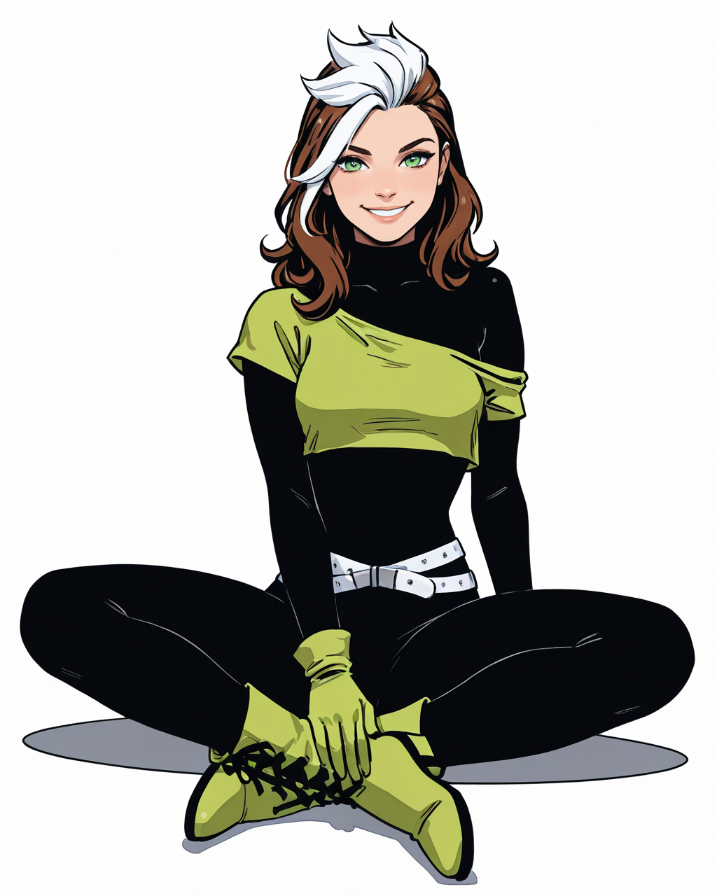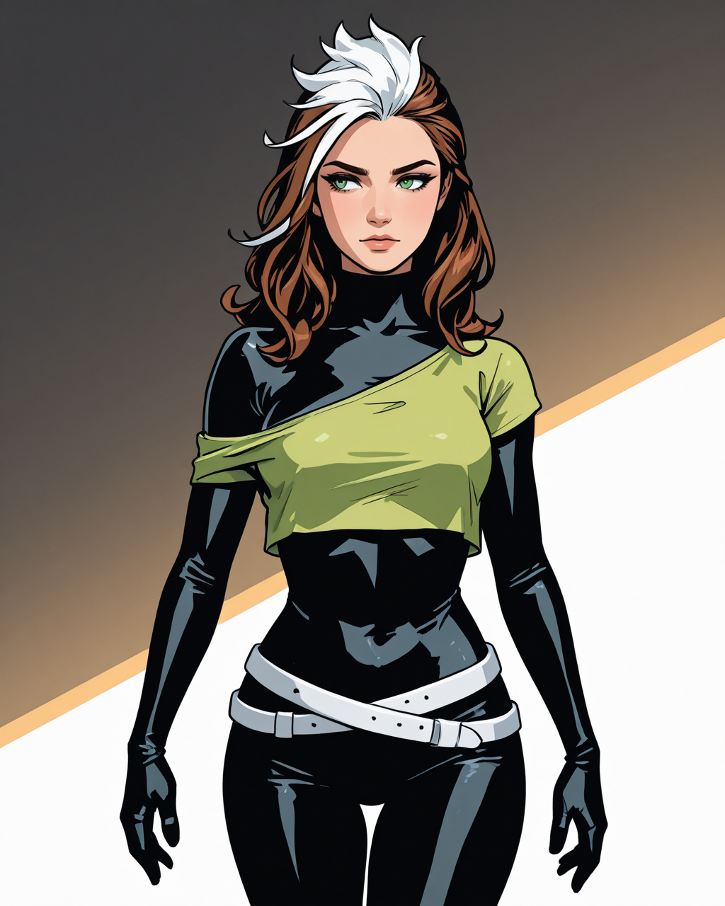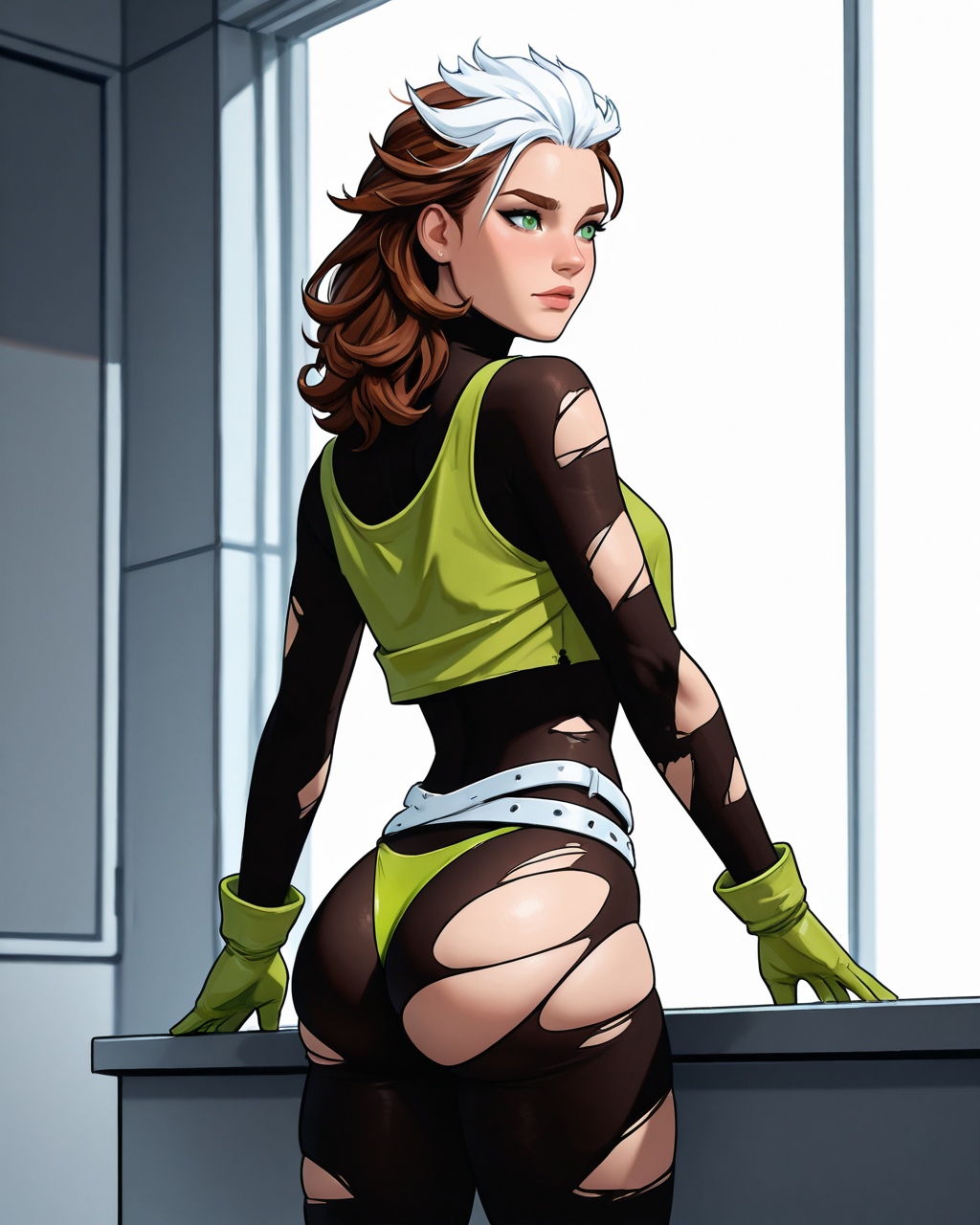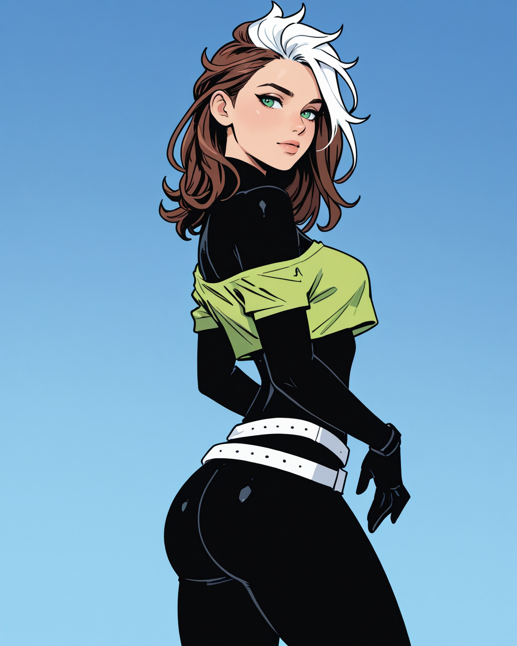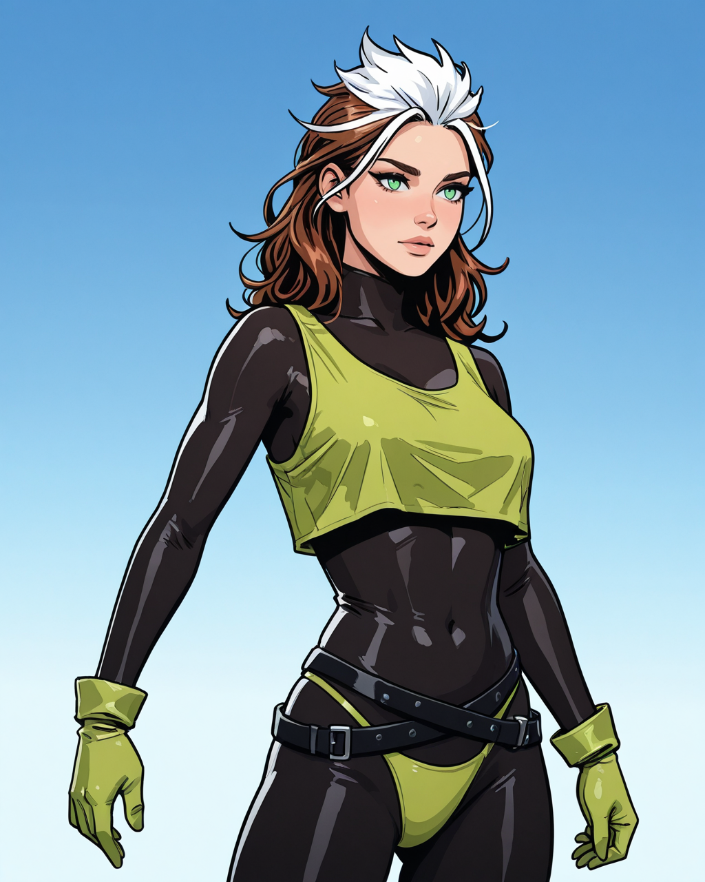 触发词:roguepunk, 棕发, 白发, 双色发, 绿眼, 连体衣, 无袖背心, 腰带, 手套