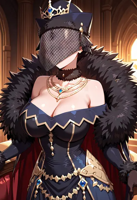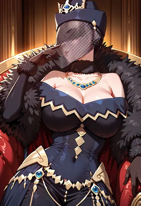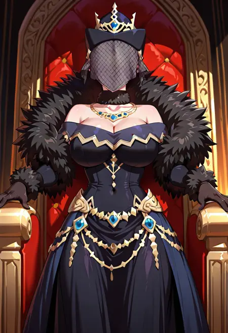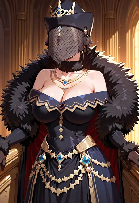 グレモリー、女性1人、ヴェール付き帽子、顔隠し、ファー trimming、チョーカー、ネックレス、胸、黒いロングドレス、手袋、オーバーレイ青スカート+ゴールドチェーン、ベルト