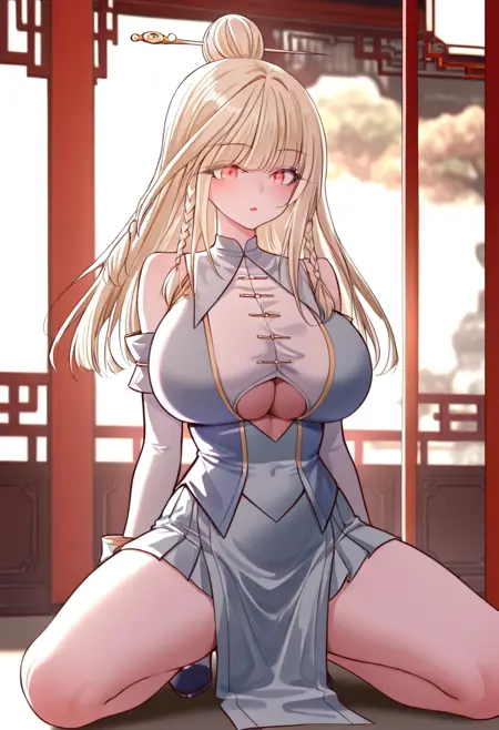 whq,1girl,solo,long hair,blonde hair,braid,hair ornament,hair stick,hair bun,twin braids,bare shoulders,detached sleeves,red eyes,single hair bun,underboob,underboob cutout,dress