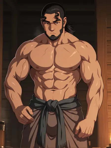 Thors, muscular, sideburns, mature male, black eyes, facial hair, ponytail