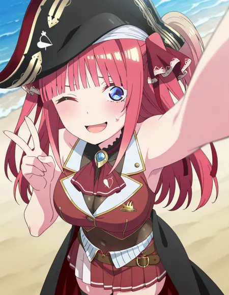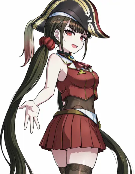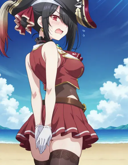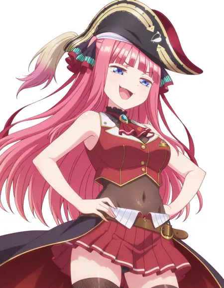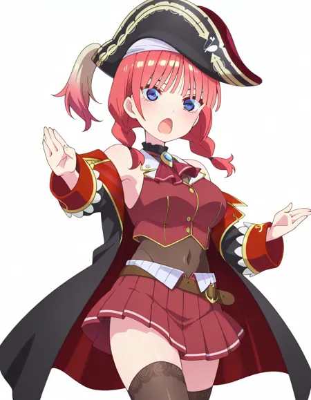 lora:marine-houshou-cosplay-illustriousxl-lora-nochekaiser:1, marine houshou cosplay, houshou marine (cosplay), 领结,腰带,黑色项圈,黑色外套,黑色过膝袜,棕色腰带,遮盖肚脐,短款夹克,荷叶边项圈,荷叶边,夹克,皮带,紧身衣,衣内紧身衣,海盗帽,百褶裙,红色领结,红色外套,红色夹克,红色丝带,红色裙子,裙子,无袖,无袖夹克,过膝袜,双面外套,双面面料,
