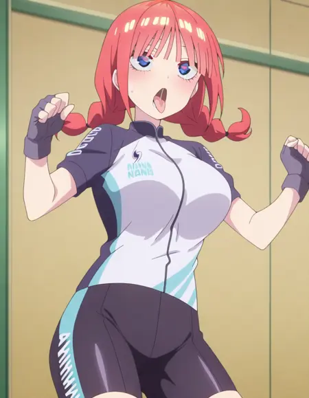 lora:cycling-uniform-illustriousxl-lora-nochekaiser:1, cycling uniform, bike jersey, bike shorts, biker clothes, fingerless gloves, gloves, short sleeves, cleavage