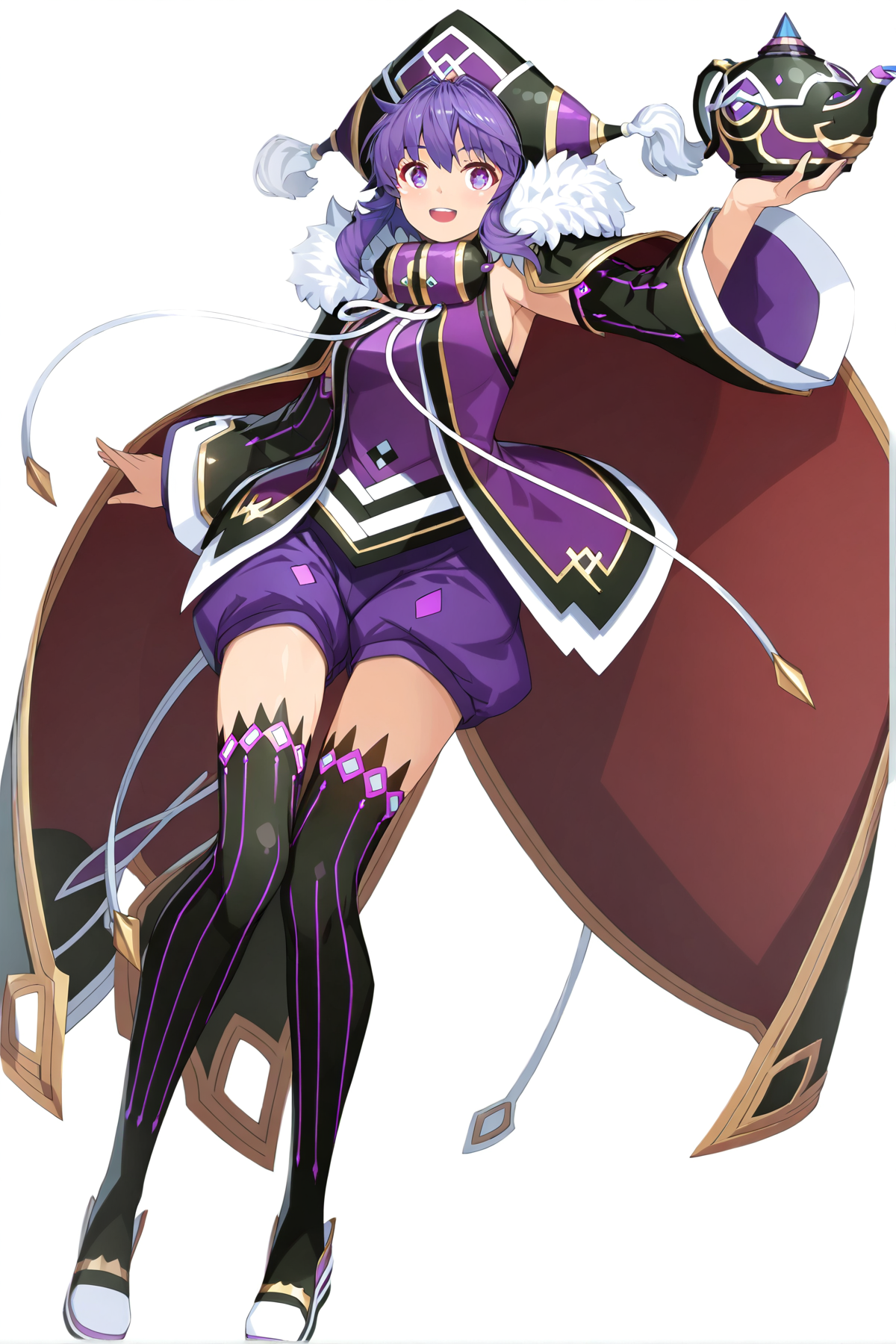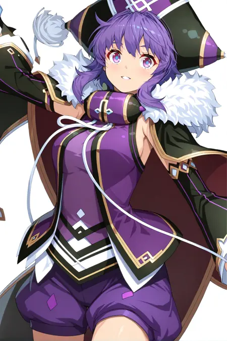 purple eyes, purple hair, warlock hat, side boobs, purple dress, purple vest, magician robe, detached sleeves, black wide sleeves, purple puffy shorts, black thighhigh, white footwear