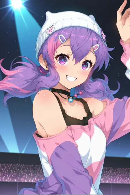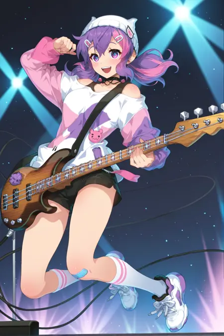 purple eyes, purple eyes, medium hair, low twintails, hair clips, white beanie with pointy horns, choker, bare shoulders, multicolored long sleeves shirt, black shorts, bandaid on knee, white knee socks, white sneakers