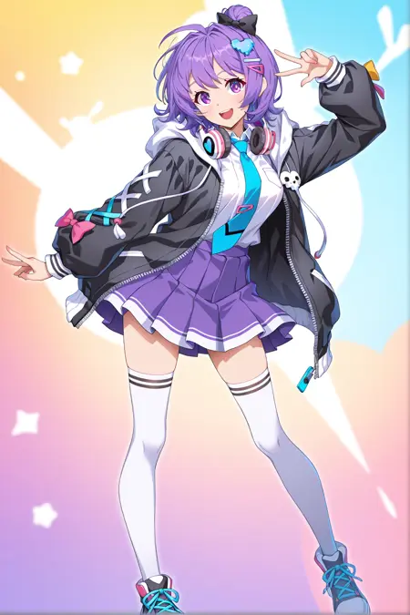 purple eyes, ahoge, purple hair, short hair, hair ornament, hair clip, black hairbow, hairbun, headset on neck, medium breasts, white shirt, blue necktie, black jacket with white hood, open jacket, purple pleated skirt, white thighhigh, shoes