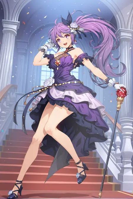 purple eyes, purple hair, long hair, single side ponytail, hair ornament, choker, purple one piece dress, see-through cleavage dress, bare shoulders, short sleeves, jewelry, white gloves, frill skirt, black high heels